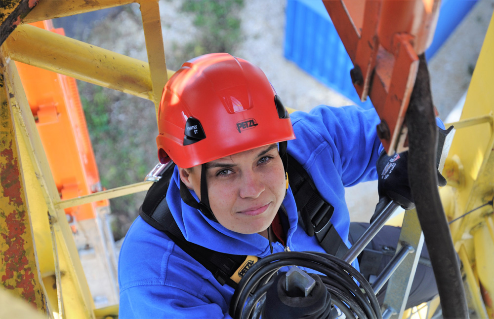 Neben dem praktischen Einstudieren der notwendigen Handgriffe und der korrekten Handhabung von Karabinern, Seilen und Ösen lernt sie in luftiger Höhe vom AST Trainerteam vor allem eines: Ruhe bewahren und Sicherheit vermitteln. Miriam Winter: „Auf einem Kran stehend wird schnell klar, dass man Menschen, die in Panik geraten, wohl kaum aus dieser Lage befreien kann.“ Doch nach etwa einer halben Stunde ist es geschafft und die zu rettende Person hat wieder festen Boden unter den Füßen. Dank Miriam Winter, die vor ihrem eigenen Abstieg durch den Kranturm nun doch noch ein paar Momente Zeit findet, die herrliche Umgebung zu genießen. Hier, hoch über den Campus M der Blausteiner AST Arbeitssicherheit und Technik GmbH.